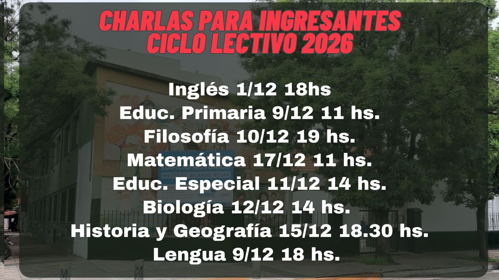 El Instituto Ricardo Rojas invita a los futuros ingresantes a participar de las charlas informativas que se desarrollarán de manera presencial en nuestra institución.